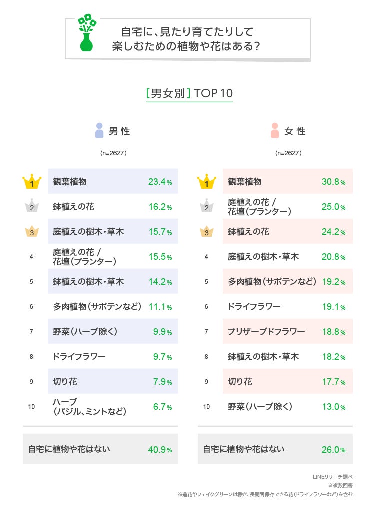 このたびLINEリサーチでは、日本全国の男女を対象に、自宅で見たり育てたりして楽しむ植物・花の種類などについて調査しましたので、その結果をお知らせいたします。