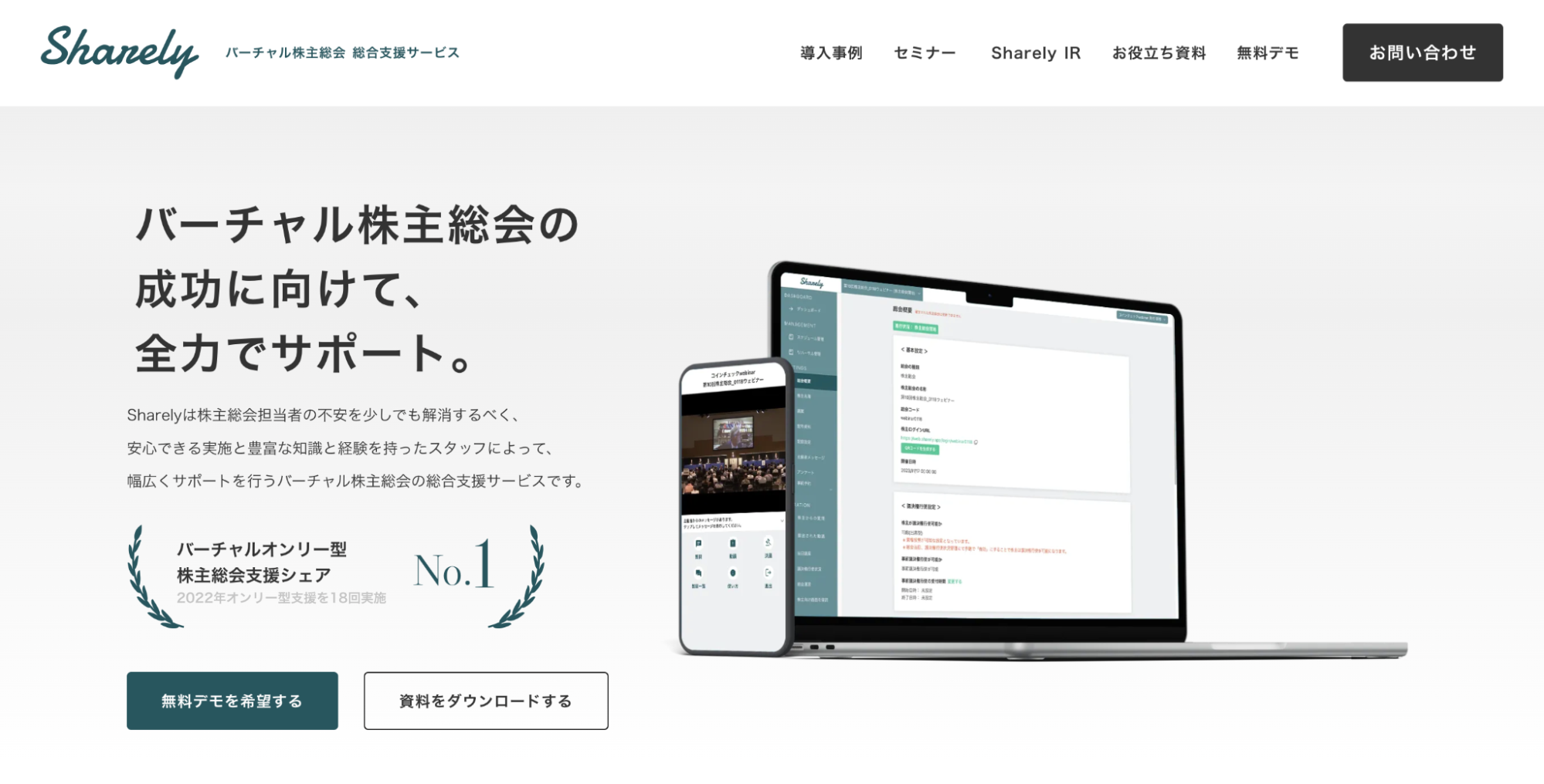 ハイブリッド参加型・出席型、バーチャルオンリー型のあらゆるバーチャル株主総会や決算説明会、オンラインイベントにも対応可能なクラウドシステムの提供に加え、バーチャル株主総会に合わせた招集通知やシナリオのレビュー、そして運営サポート等も提供しています。さらに、バーチャル株主総会中止保険や国内大手IRメディアとの議案訴求誘導枠の提供など新たな取組みを実施しています。