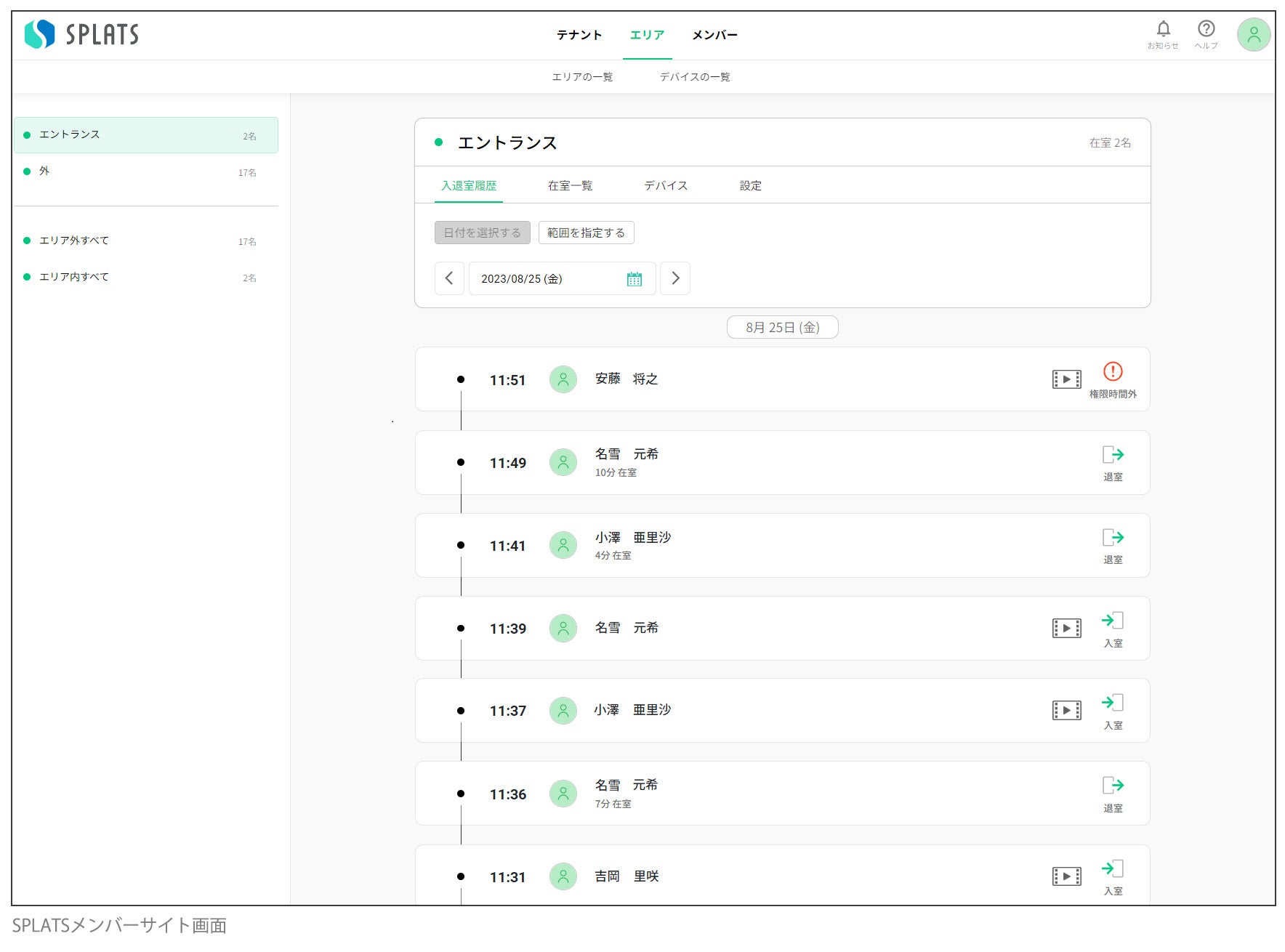 専用のSPLATSカメラを設置することで、特定のイベントが発生した際に前後数秒間が自動的に録画され、SPLATSメンバーサイト上ですぐに確認することができるほか、リアルタイムの映像を確認することも可能です。