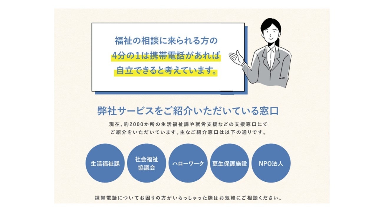 例えば、厚労省管轄の生活保護や生活困窮の窓口で、携帯電話にお困りの方がいた際は、『誰でもスマホ』をご紹介いただいております