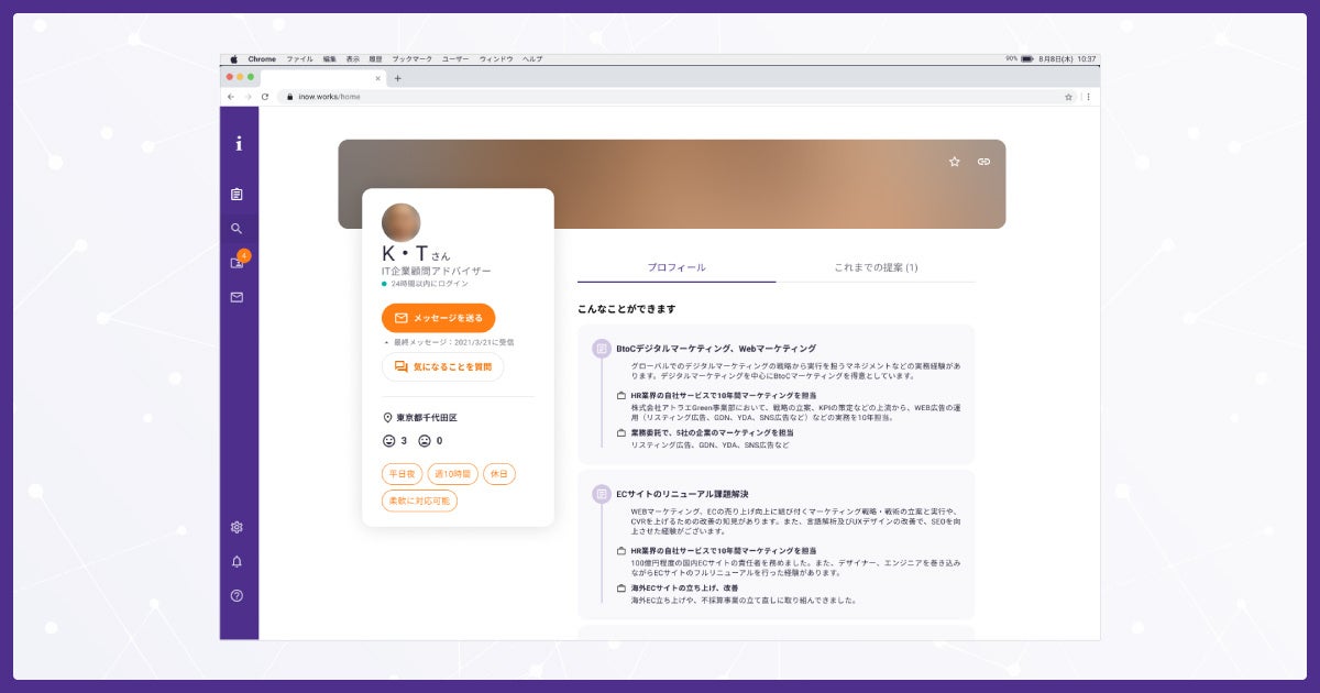 プロ人材のプロフィールも、「できること」という項目を上部に表示させるようにし、経歴の特徴や強みを瞬時に把握できるデザインに刷新しました。プロフィール内には、これまで企業へ送った「提案」も蓄積されていき、プロフィール情報と合わせて一覧で確認できるようになります。
