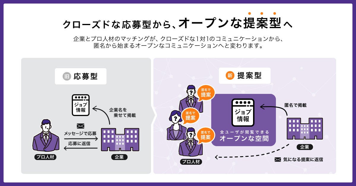 リニューアル後は、企業が具体的な「ジョブ情報」を公開し、そこにプロ人材が「提案」できるオープンなサービス体験へと変更になります。「ジョブ情報」や「提案」は、いずれも匿名で公開でき、投稿主以外のご利用企業さまやプロ人材も閲覧及び反応することが可能となります。