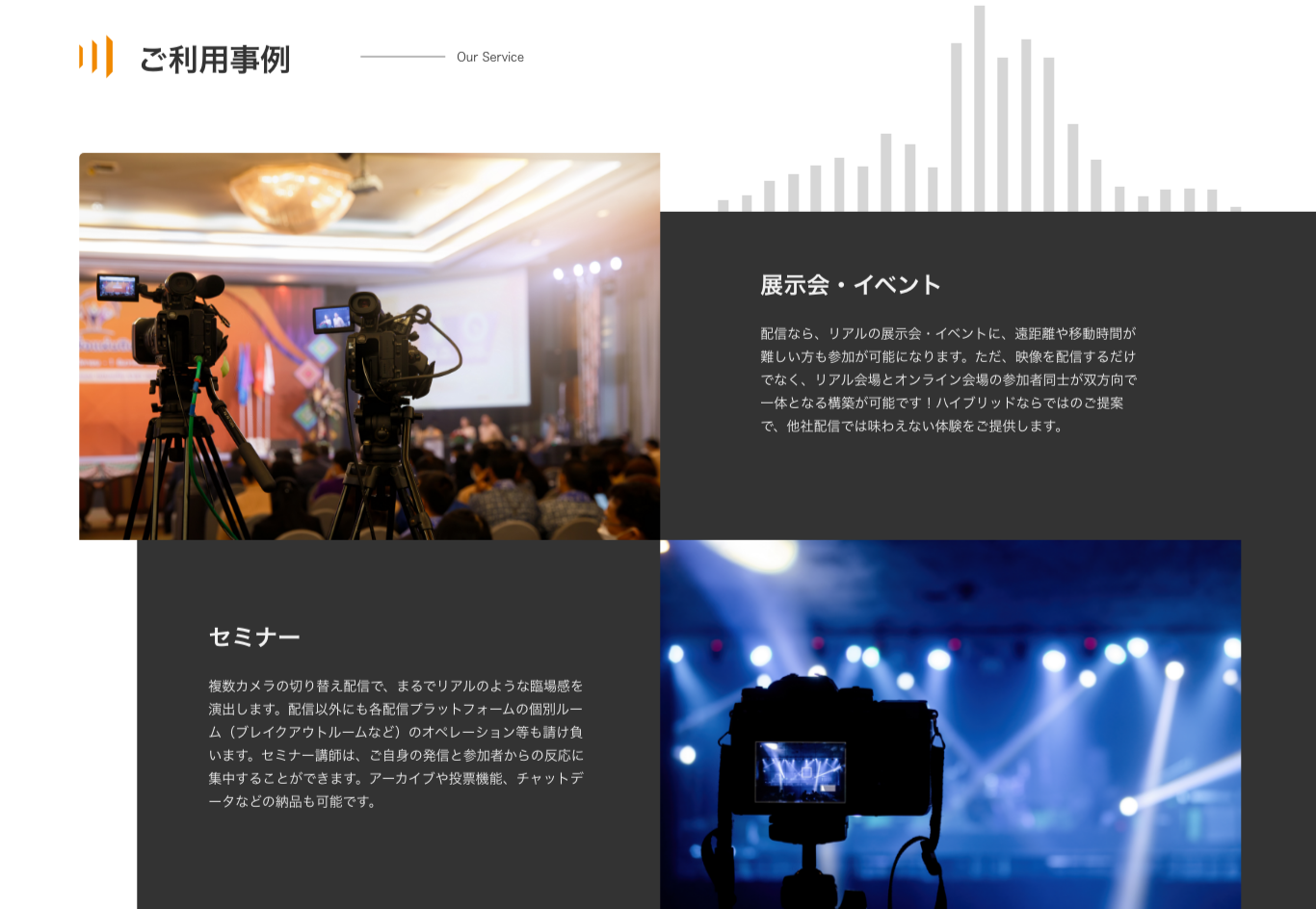 撮影・配信・企画・運営・自社スタジオ・動画制作・スタッフ派遣・機材持ち込みなど、お客様それぞれのニーズにお応えします。
