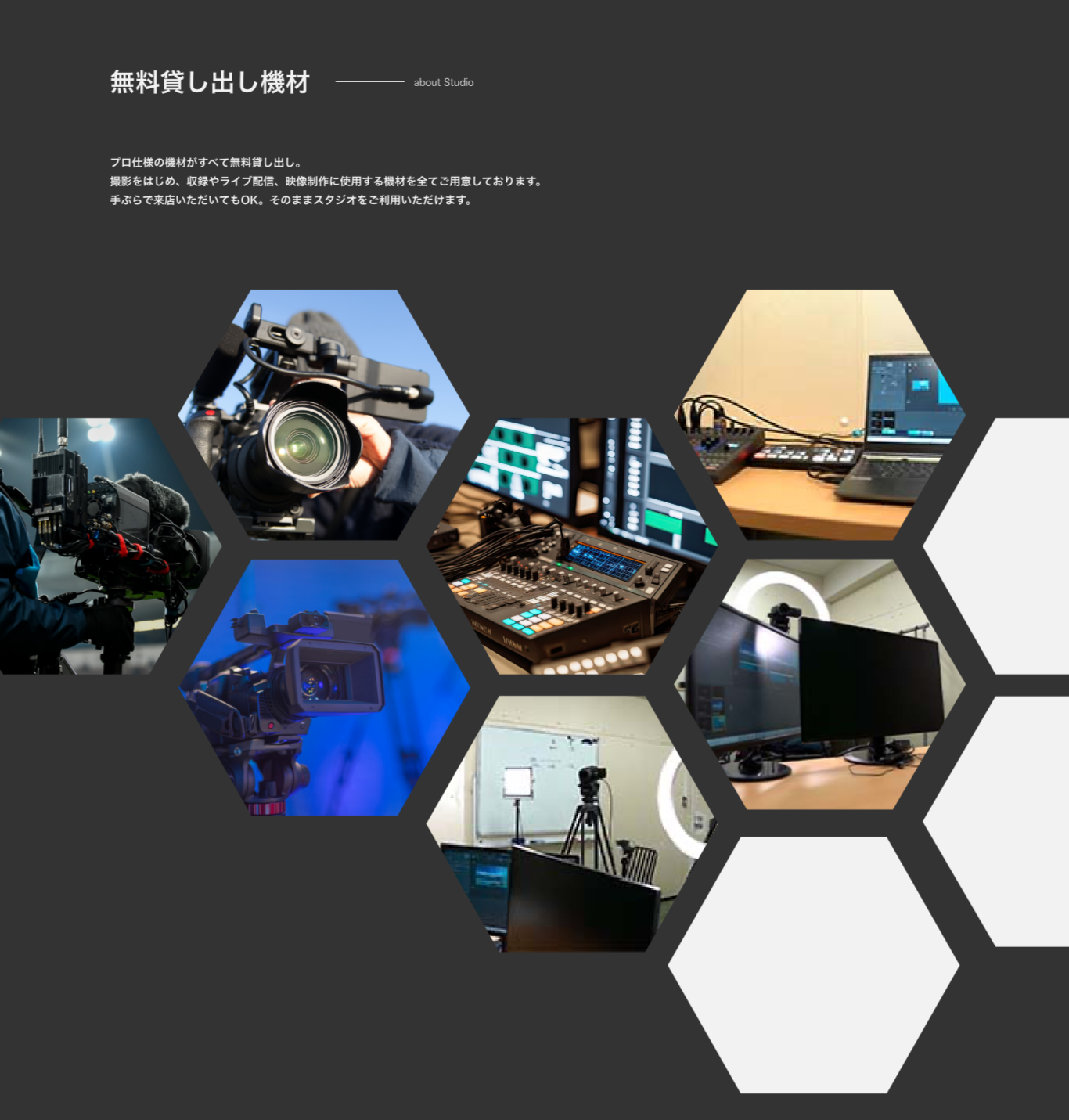 スタジオの様子がわかる写真や、本格的な貸し出し機材について掲載しています。手ぶらでのご来店で、配信が可能です。