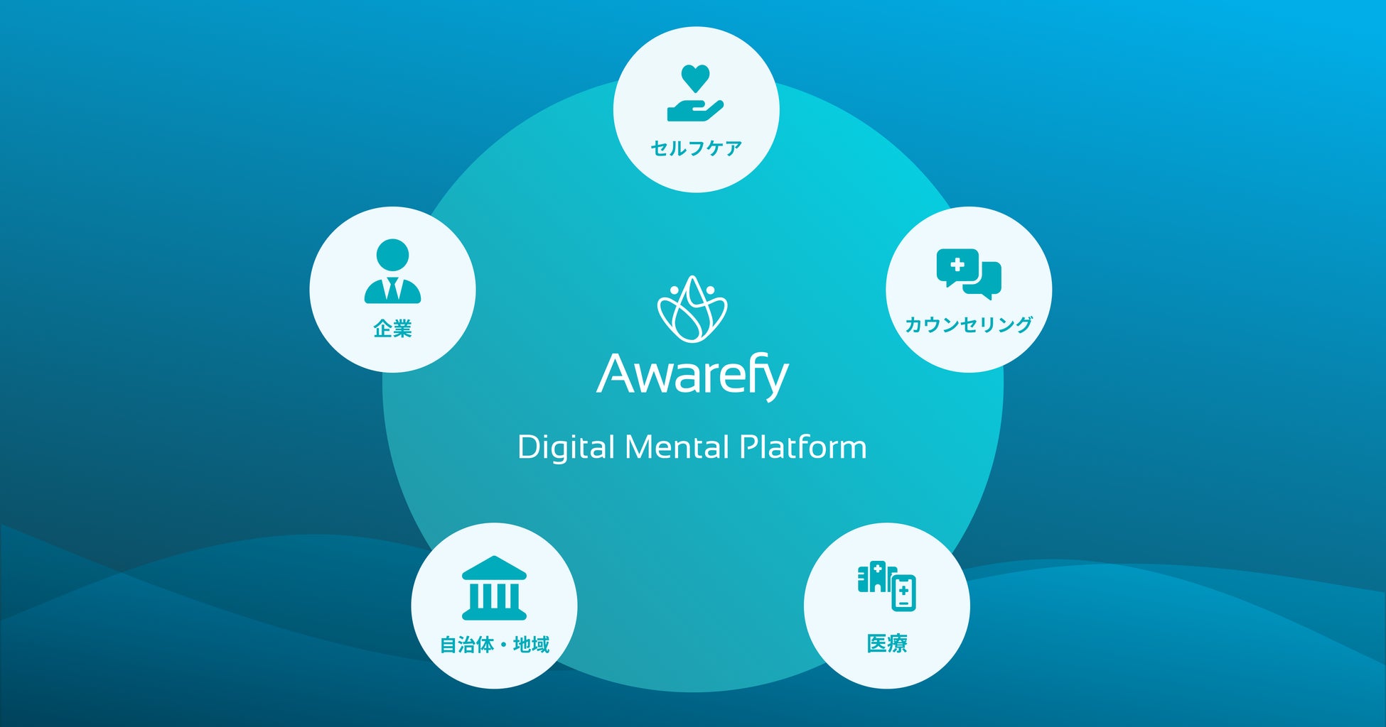 Awarefyは「ストレスに負けないスキルが身につく」をコンセプトとしたスマホアプリです。認知行動療法をベースとして、自己理解を深める感情や調子のグラフ化、ネガティブ思考をやわらげるマインドフルネス瞑想、ストレス対処のコーピングリスト、AIによるチャット・アドバイス機能など、さまざまなセルフケアの機能を提供しています。また、メンタルクリニックへの接続や公共の相談窓口の案内等専門機関との連携も進めており、心の健康を総合的に支えるデジタル・メンタル・プラットフォームとなることを目指しています。