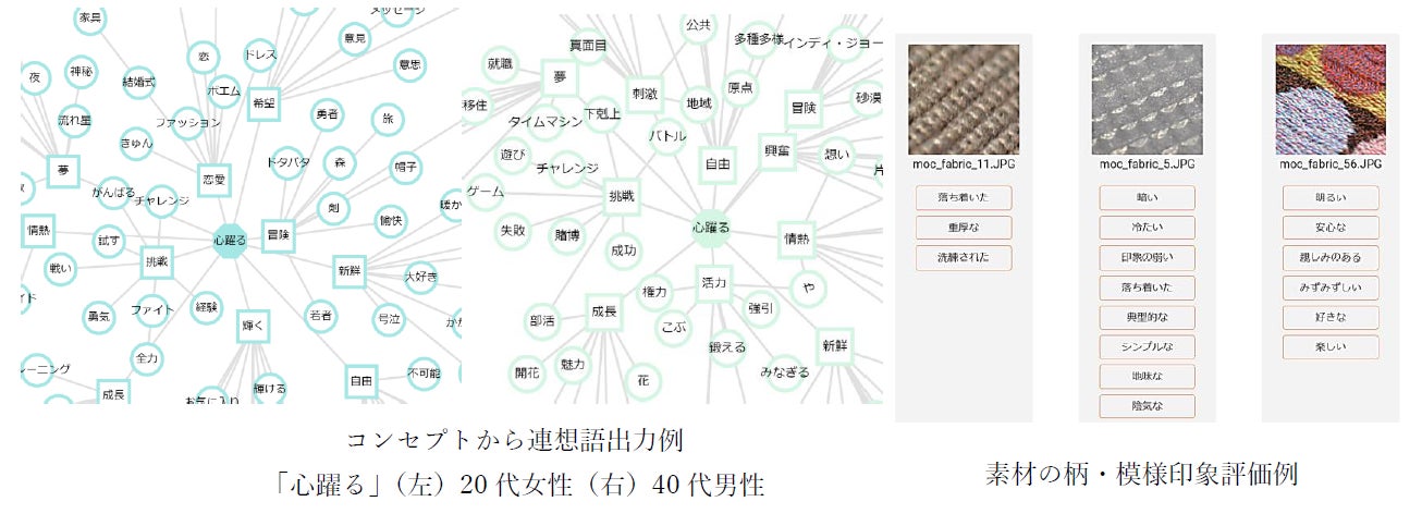 その他、商品のコンセプトワードから消費者がどのような連想をするかを性別・年代別に出力する機能や、素材の柄や模様が与える印象を評価する機能を搭載します。
