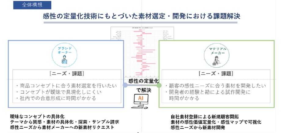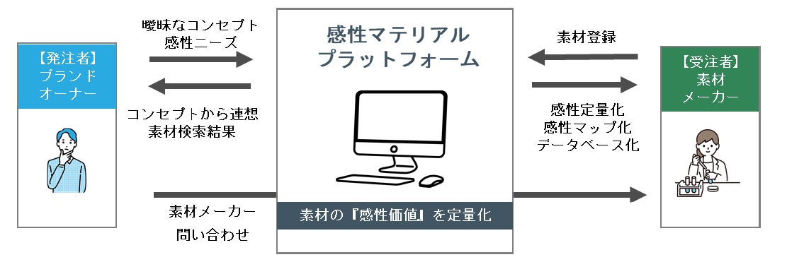 本プラットフォームは、素材がもたらす感性価値を数値化して客観的に提示する定量化技術によって、主観的で曖昧な感性ニーズから素材の探索・開発・イノベーション創出を目指すプラットフォームです。素材メーカー及びブランドオーナーにおける、曖昧なコンセプトや感性ニーズからの素材選択や新素材開発における課題解決への貢献を目指します。