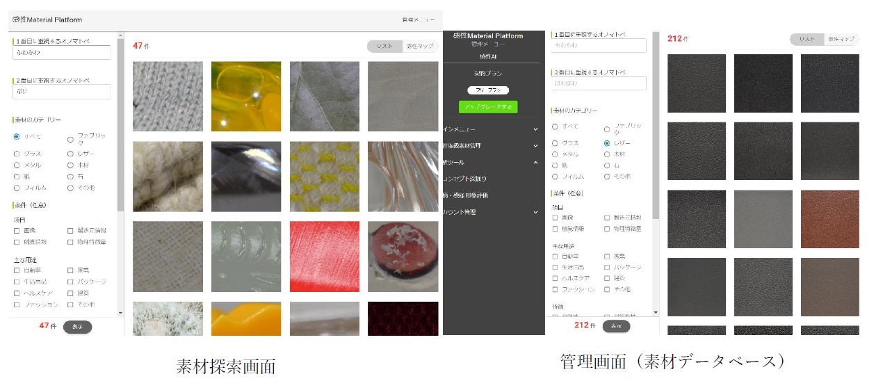 今回実証提供を開始するβ版では、素材の触感を表現するオノマトペ(擬音語・擬態語)を基軸にプラットフォーム上の素材を探索できるほか、様々なマテリアルの質感イメージ画像も表示することで、デザインのイメージを膨らませます。なお、素材メーカーによって登録された素材は、素材それぞれの触感の感性を定量化させながら各社の管理画面上でデータベース化することが可能です。
