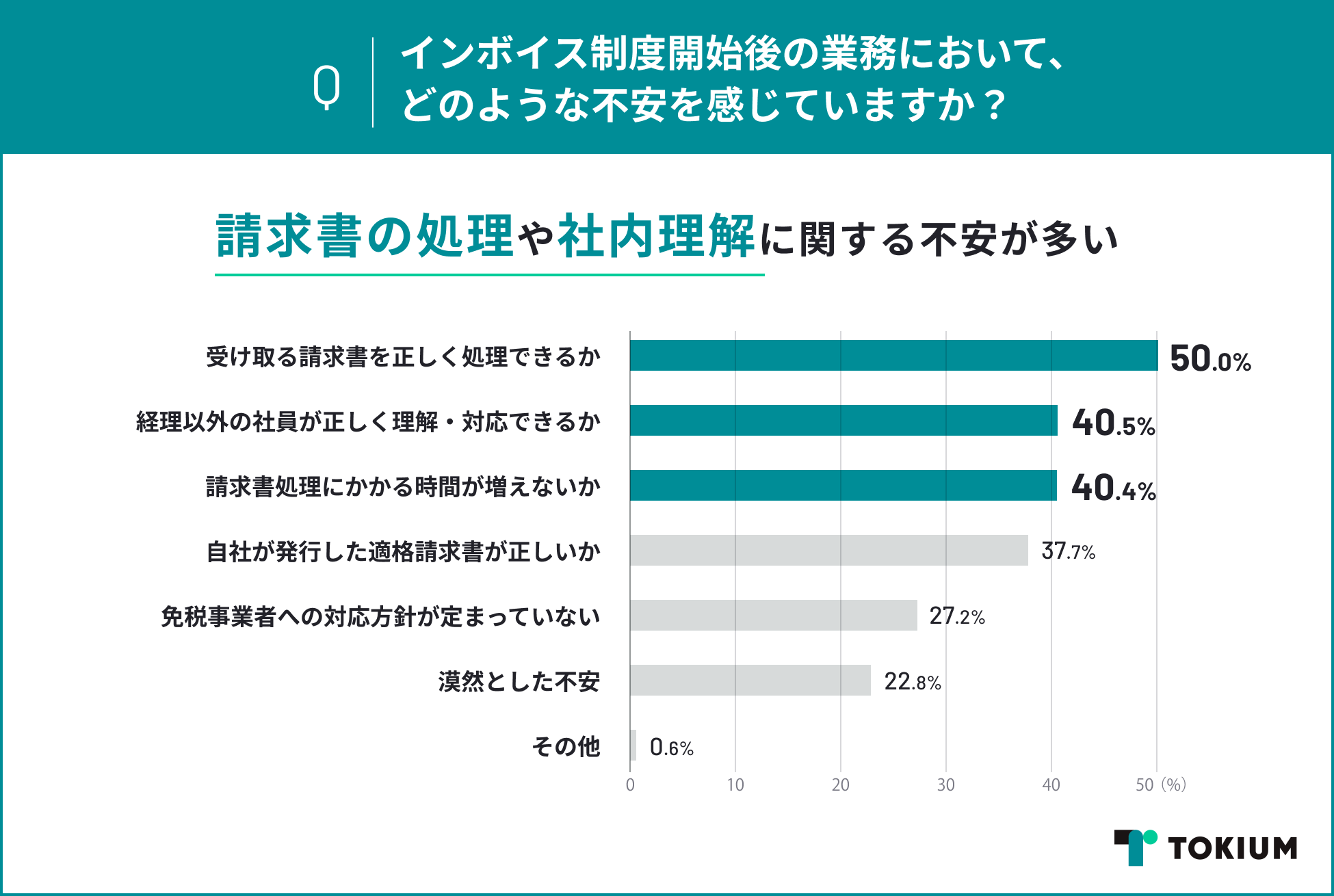 さらに、「経理以外の社員が正しく理解・対応できるか」についても40.5%が不安を抱えており、2番目に多い要因となりました。インボイス制度は、経理だけではなく全社に影響を及ぼすため、社内での理解促進や規定の浸透、従業員による適切な請求書の処理が課題となっていることがわかります。