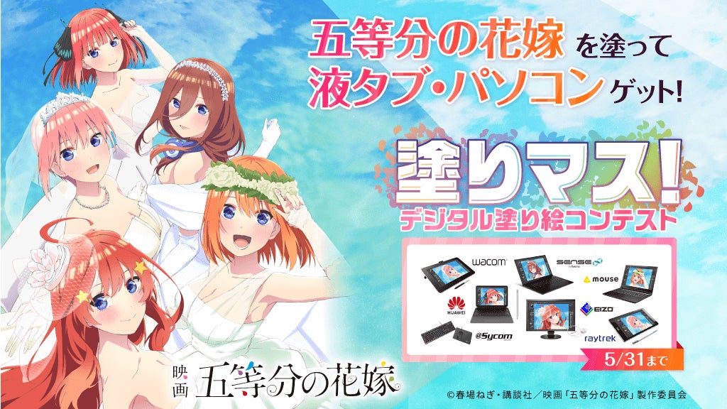 入賞者には、有名メーカーのペンタブレットやパソコン、ペイントアプリなどのクリエイター向け豪華賞品、映画「五等分の花嫁」の関連グッズのほか、ご自身の応募作品がプリントされたアクリルパネルがプレゼントされます。