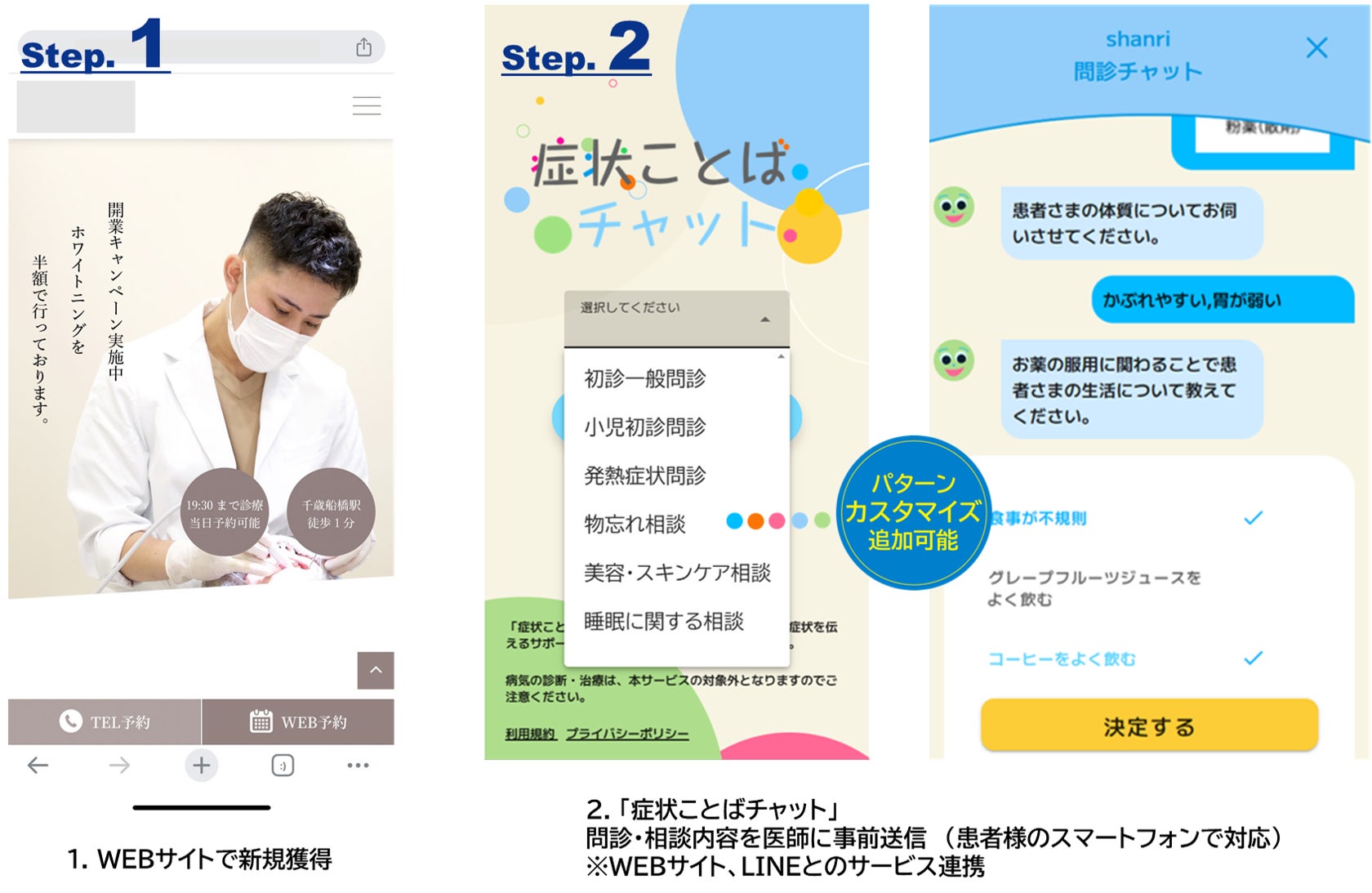 まずはWEBサイトで、SEOやCVR最適化を最大限に考慮させて制作させていただいており、新患獲得を最優先に考えてサイトを制作させていただきます。今までの弊社のサービスでは新患獲得までで終わってしまっておりましたが、今後は「症状ことばチャット」と「LINE」を活用することで、来院から患者様の来院までを一貫してサポートできる施策を展開させていただきます。