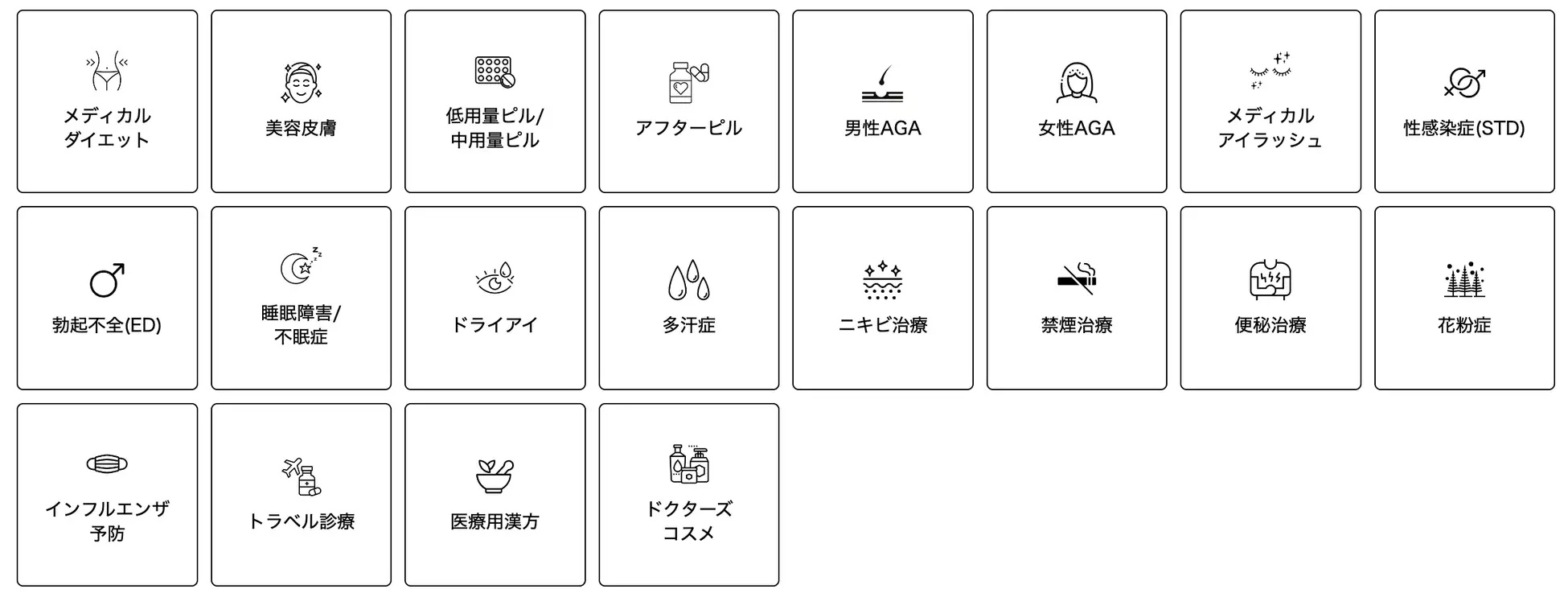 『デジタルクリニックグループ』は24時間365日受付・チャット相談が可能であるため、仕事が忙しくて病院に行けない方でも、スキマ時間や自宅で気になっていた治療をオンラインでお気軽に始められます。また、当院では20科目の診療科目を扱っており、メディカルダイエットや低用量ピル、不眠症・睡眠障害など働く世代が抱える多様なお悩みに合わせたオンライン診療が可能です。