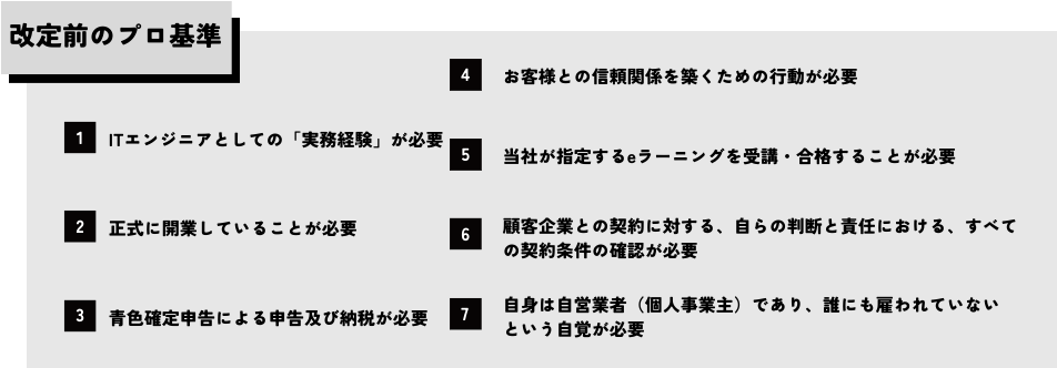 この流れをさらに推し進める事を目的に、顧客企業、プロエンジニア、フリーランス全体へ独自調査をした結果、プロ基準の見直しを行う運びとなりました。