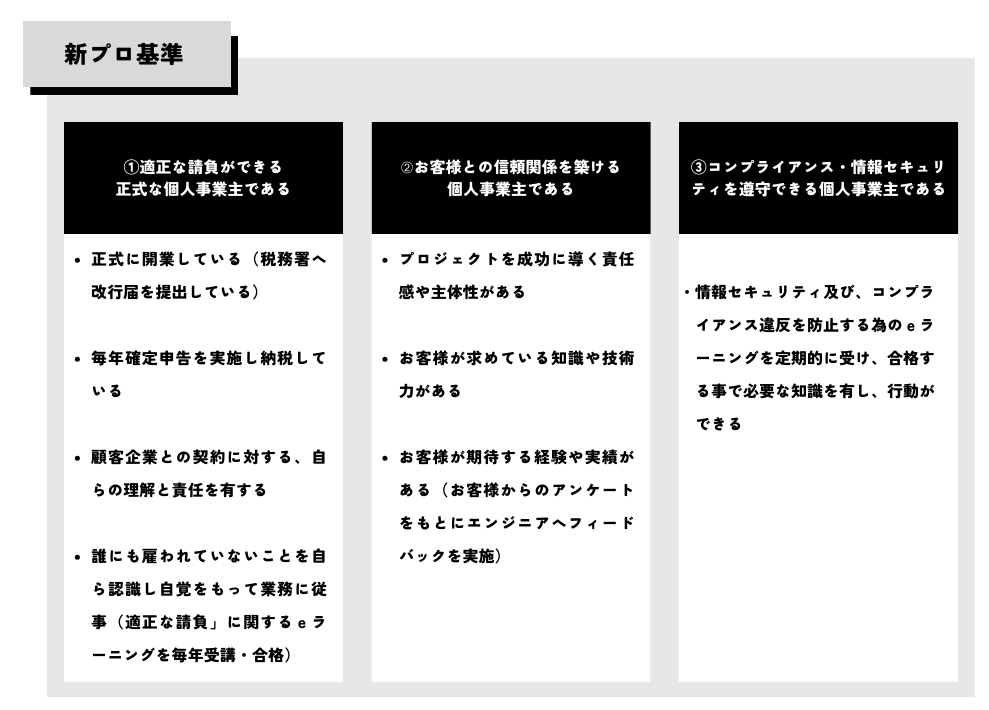 2023年9月1日より運用される新「プロ基準」では、①個人事業主として適正な手続きが完了しているか、②信頼ができる個人事業主か、③コンプライアンスや情報セキュリティを遵守できているか、の主に3つの観点から、基準が選定されることとなります。