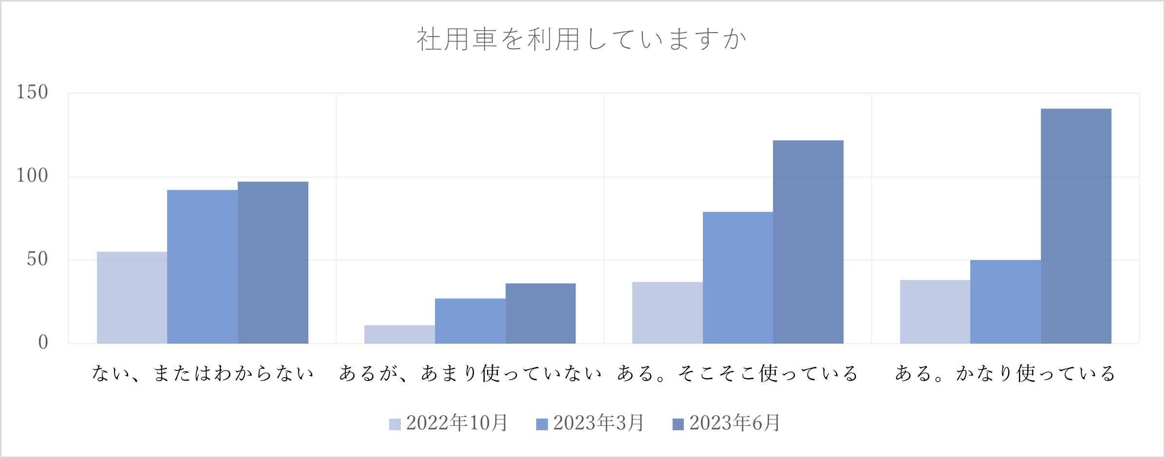 また、「社用車を利用していますか」という設問に対して2023年3月以降に登録がある企業からの回答では「ある。かなり使っている」という回答数がほかの回答と比較して増加していることから、国内中小企業の脱炭素や環境保全への取り組みに課題があることが見て取れます。