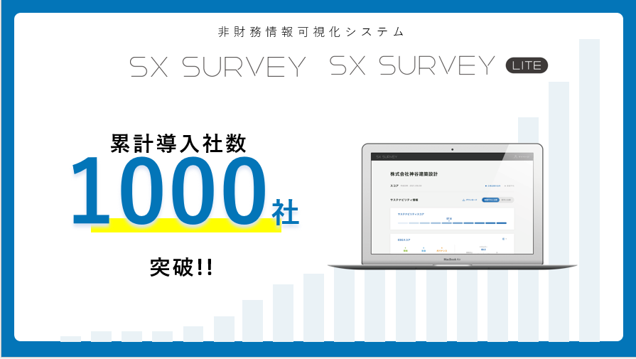 非財務情報可視化サービス「SXサーベイ」及び「SXサーベイLITE」の合計利用社数が、2022年1月のSXサーベイSaaS版のサービス開始以来、1000社を突破しました。