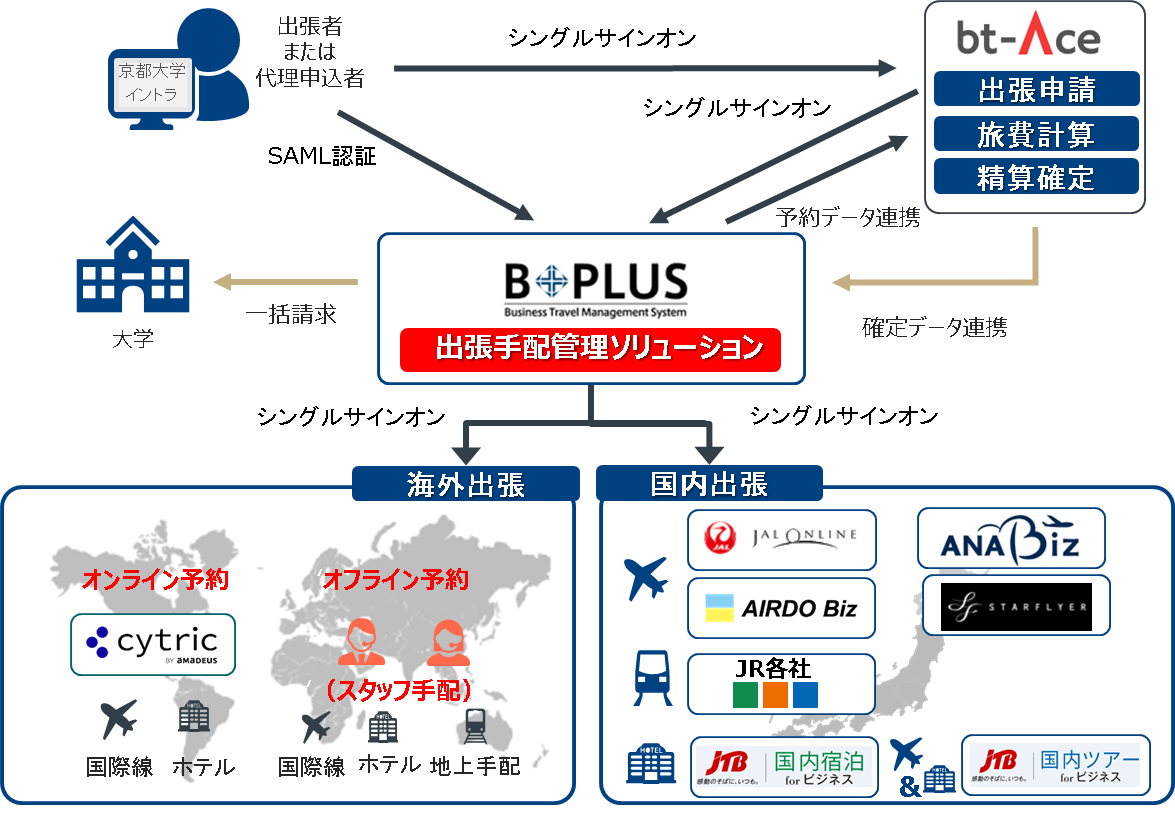 『B+PLUS』は、国内・海外出張の手配が可能なオンラインブッキングツールを備えた出張手配管理ソリューションです。B+PLUSにて手配したJRや航空券・宿泊等の旅行代金はJTB-CWTから大学様への一括請求が可能になります。またB+PLUSで手配された旅程は旅費システム『bt-Ace』に自動連携し、旅費精算にかかる事務作業の効率化を実現することができます。