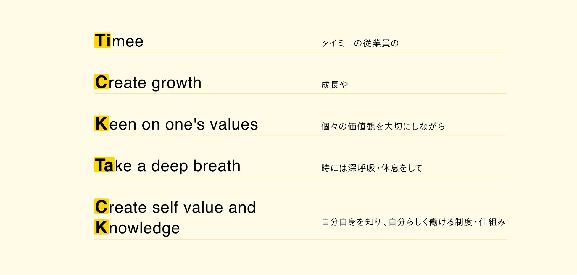 タイミーでは、全ての従業員がビジョン・ミッション・バリューを体現するため、福利厚生制度に力を入れています。仕事においても生活においても、「自分の時間」をどう過ごすかを考え、一人ひとりの時間が豊かになることを目指し支援しています。