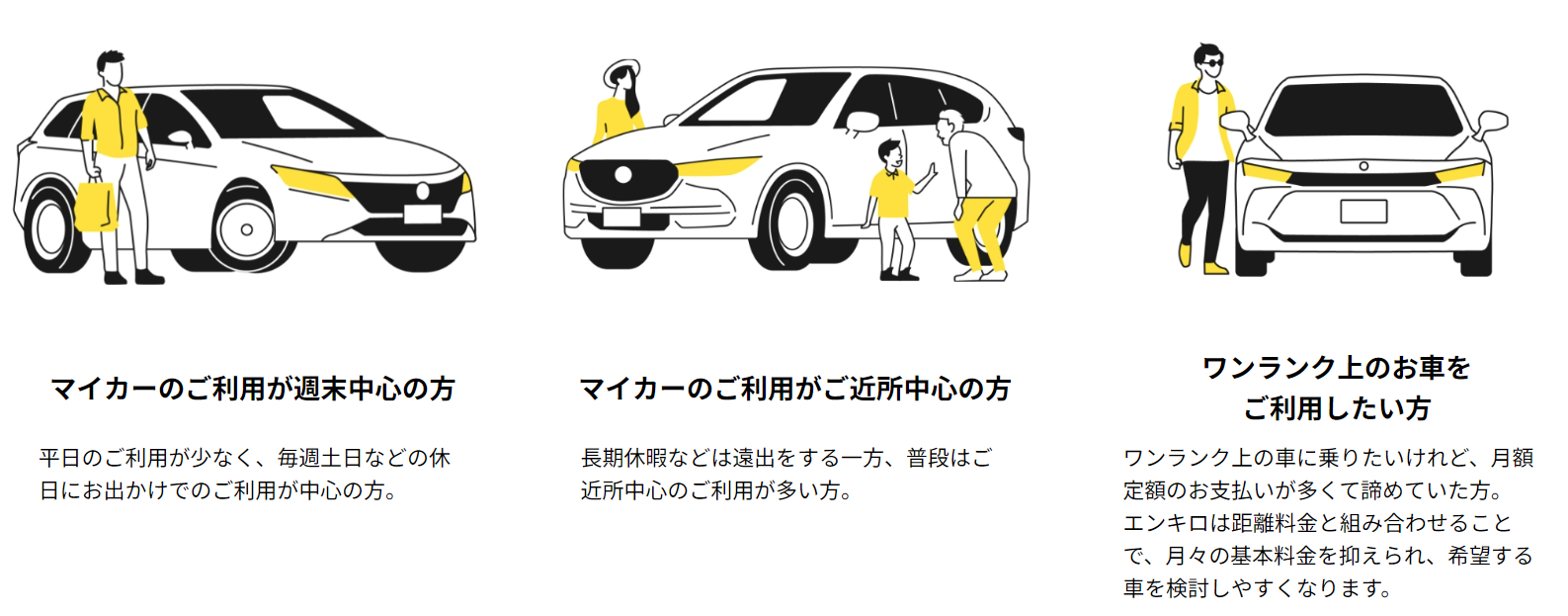「エンキロ (https://yenkilo.jp/)」は、お車をリースでご契約いただき、月額固定基本料金と、走行距離1kmあたりの距離料金でお支払いいただくマイカーサービスです。