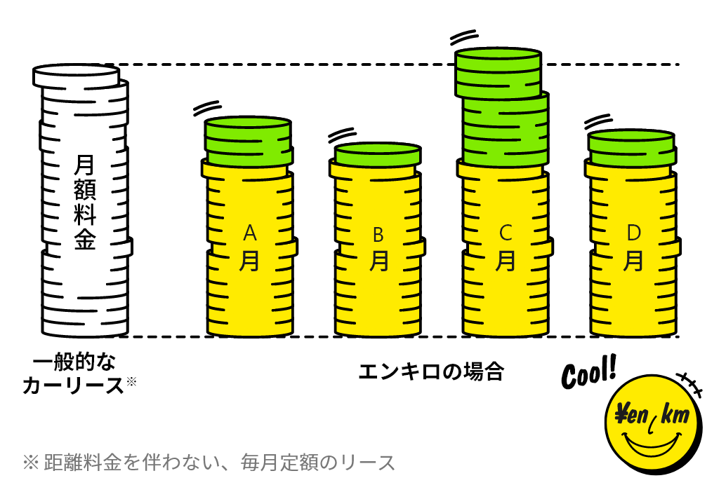 エンキロでは、お客様のご契約期間中の走行距離を最小限として想定し、月額基本料金を計算します。その分、お車の使用料として、走行距離に応じた距離料金を別に毎月いただくことで、ご利用実績に合った費用でお支払いいただけます。