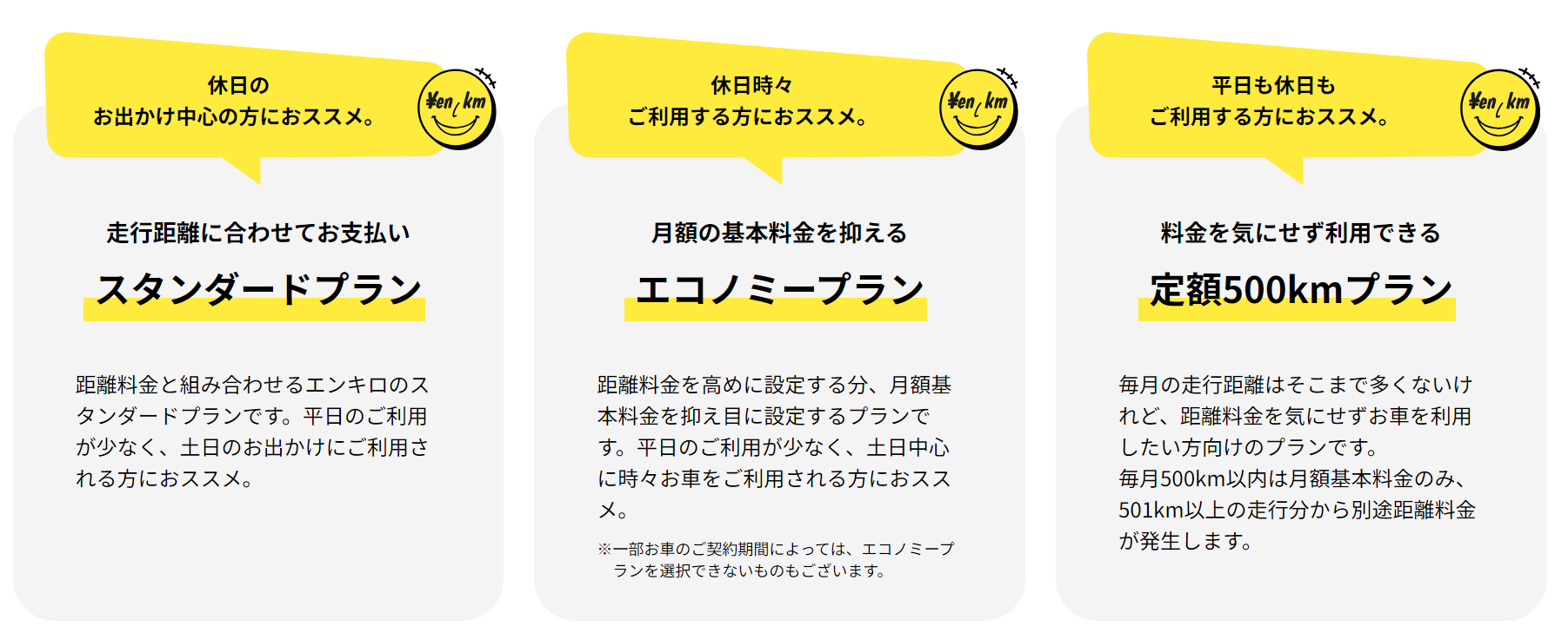 ② エコノミープラン :スタンダードプランと比較して距離料金の単価を高めに設定する代わりに月額基本料金を抑えたプラン。