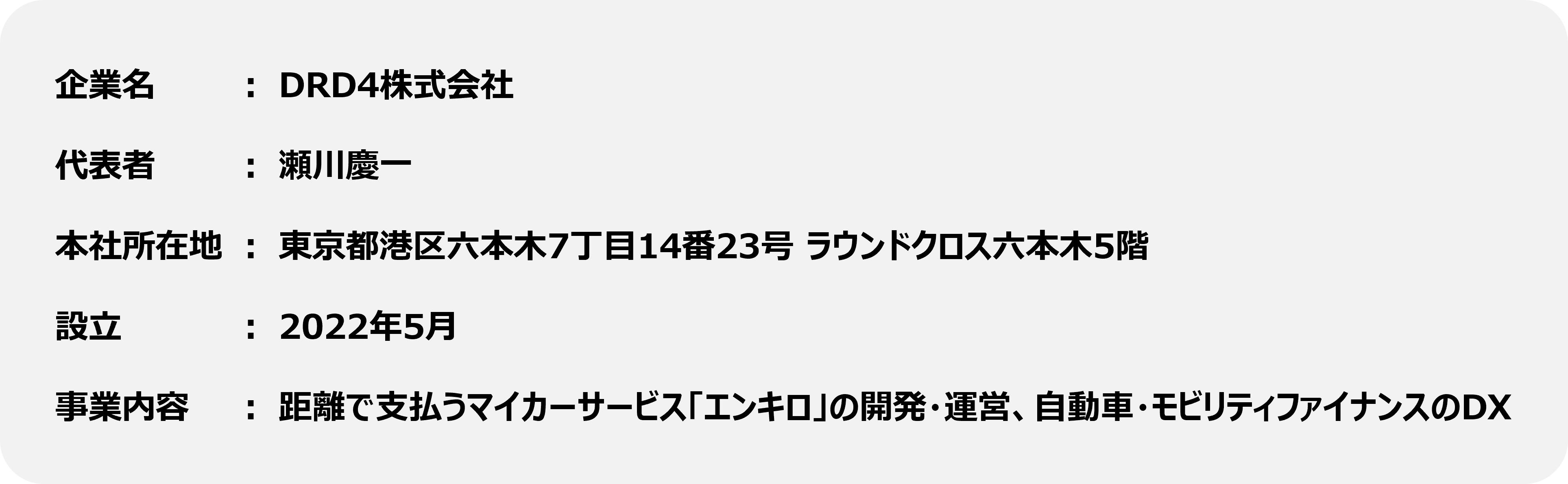 なお、運営会社であるDRD4株式会社は2023年3月に、第三者割当増資によりサイバーエージェント・キャピタル、W fund、East Venturesを新たに株主として迎え、総額約1.1億円の資金調達を実施いたしました。当社は距離で支払うマイカーサービス「エンキロ」のサービス提供を皮切りとして、今後も自動車・モビリティファイナンス領域を中心として様々なご提案を行ってまいります。