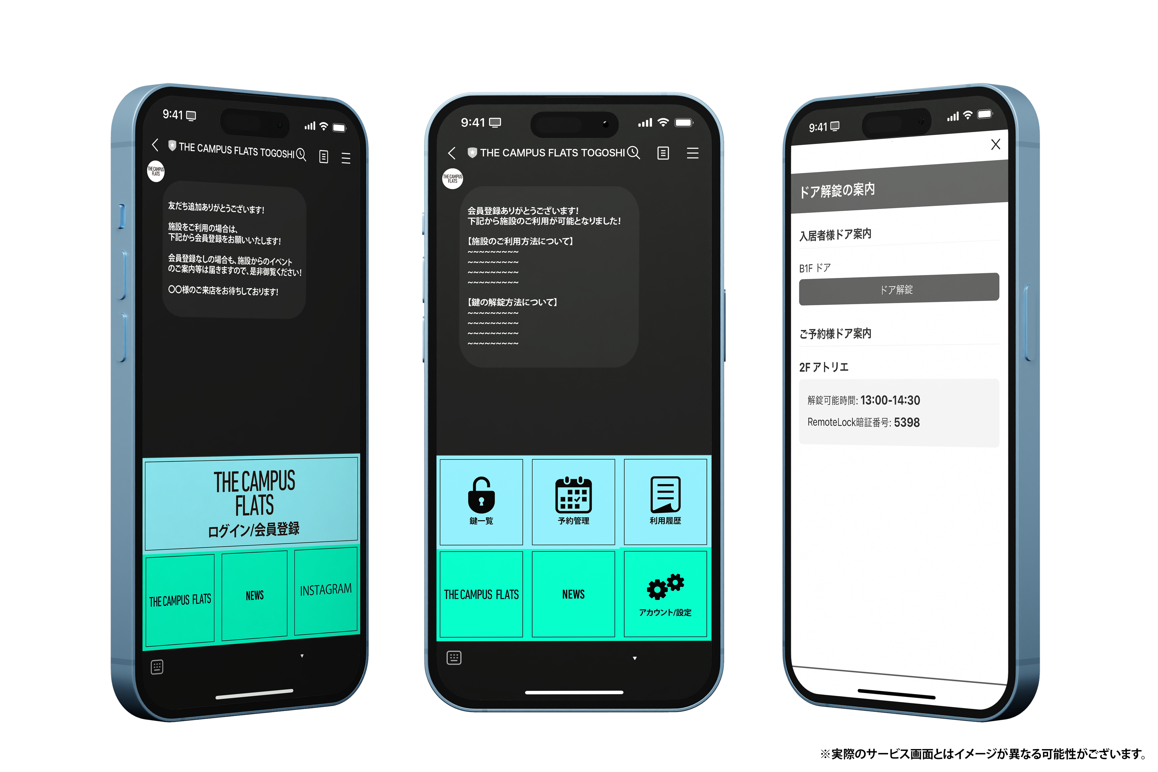 今回は、「THE CAMPUS FLATS TOGOSHI」専用のLINEミニアプリと複数のスマートロック連携での導入となります。