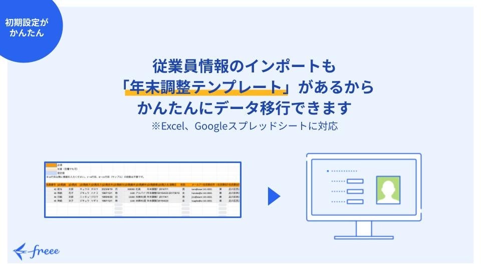 初期設定テンプレートの公開により、freee人事労務の年末調整ペーパーレスプランをご利用の方の初期設定がより簡単になり、導入時の煩雑さを解消します。