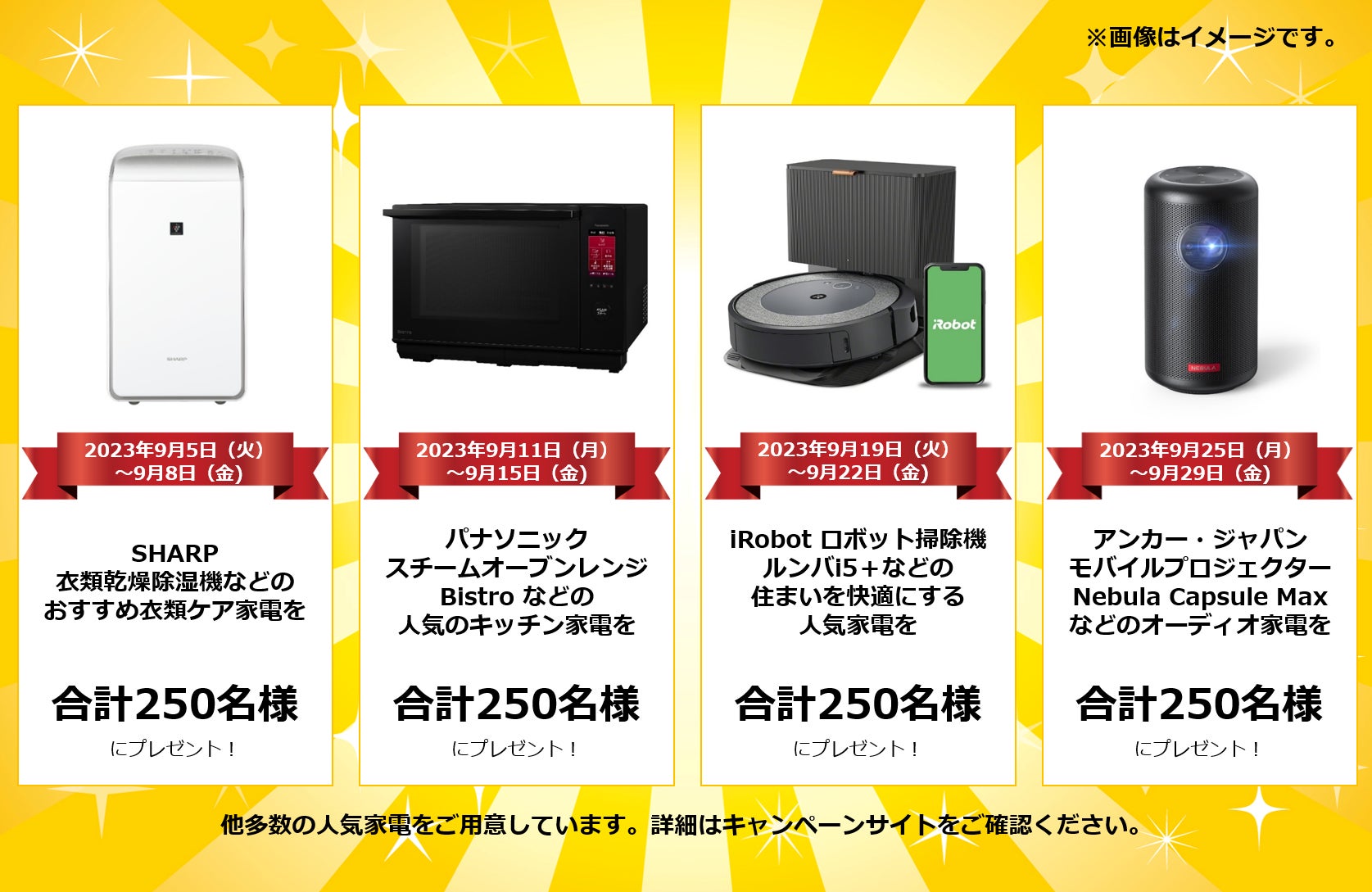 応募期間ごとに、衣食住やエンタメに特化した様々な人気家電をプレゼントいたします。