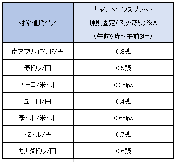 ※キャンペーンスプレッドの提示時間帯はすべて対象期間中の各営業日の午前9時~翌午前3時。同期間中の通常スプレッドは各営業日の午前3時~午前9時に提示。