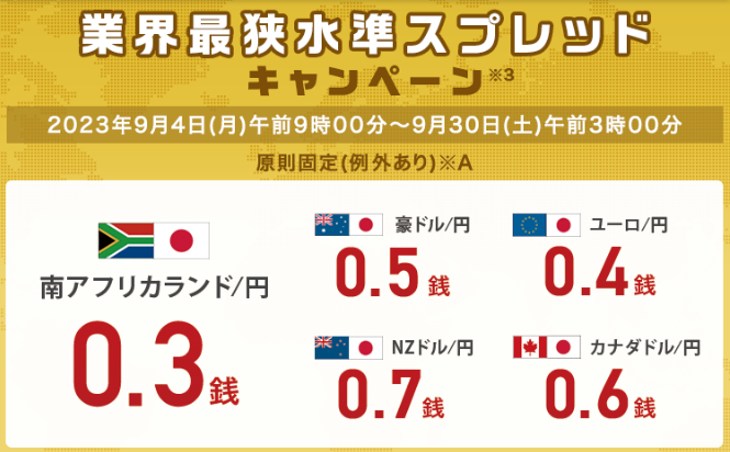 ※3 「業界最狭水準スプレッドキャンペーン」スプレッド(対象期間:2023年9月4日(月)午前9時00分~同9月30日(土)午前3時00分、提示時間帯:対象期間中の各営業日午前9時~翌午前3時)