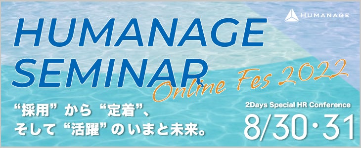 人材の“採用”から“定着”、その先の“活躍”までを支援する人材サービス事業を展開する株式会社ヒューマネージ(本社:東京都千代田区、代表取締役社長:齋藤 亮三)は、2022年8月30日(火)、31日(水)の2日間、無料オンラインセミナー「HUMANAGE SEMINAR –Online Fes 2022– “採用”から“定着”、“活躍”のこれから」を開催いたします。