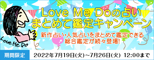 有名芸能人の結婚やスキャンダルから自然災害、政治・経済まで様々なニュースを的中させる『予言的中の占い師』Love Me Do。現在、月額公式サイト『ラブちゃん占い』にて、『Love Me Doの占い まとめて鑑定キャンペーン』を開催中です。キャンペーン期間中、サイト内で人気の占いをまとめてお得に占える総合鑑定が続々登場します。ぜひこの機会にご利用ください。