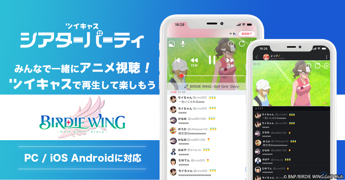 ツイキャスの「シアターパーティ」の公式コンテンツに『BIRDIE WING』が登場。配信中にシアターパーティで選択すると、期間中いつでも視聴者と一緒にアニメ映像をお楽しみいただけます。