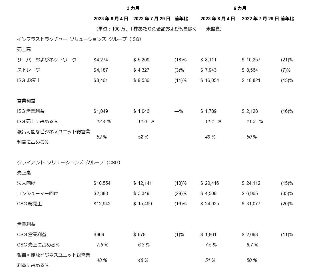 インフラストラクチャー ソリューションズ グループ(以下、ISG)の第2四半期の売上高は、前年同期比11%減、前四半期比11%増の85億ドルでした。ストレージの売上高は、業界をリードするミッドレンジ ストレージ アレイ「Dell PowerStore」とソフトウェア デファインド ストレージ「Dell PowerFlex」に対する継続的な需要の増加を背景に、42億ドルとなりました。現在「PowerFlex」は、8四半期連続で成長しており、第2四半期における需要は前年同期の2倍以上になっています。サーバーおよびネットワークの売上高は、AIで最適化したサーバーへの継続的な需要増を背景に43億ドルで、営業利益は同グループ売上の約12.4%となる10億ドルでした。