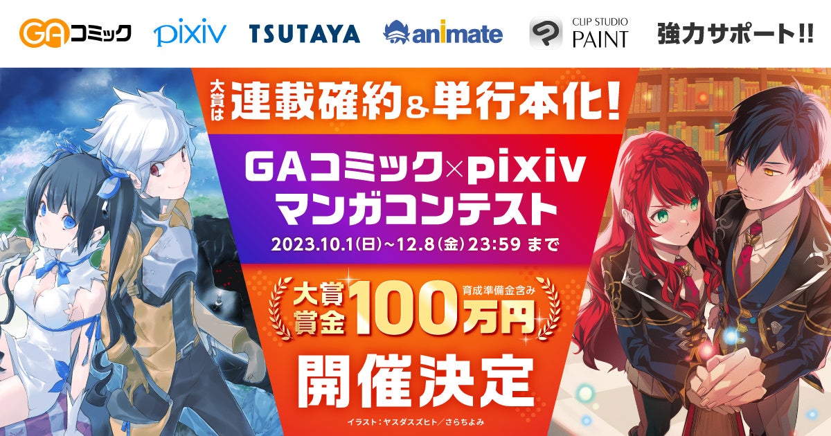 本コンテストは、「ファンタジー少年マンガ部門」「ファンタジー少女マンガ部門」「フリー部門」の3部門でマンガ作品を募集します。「ファンタジー少年マンガ部門」「ファンタジー少女マンガ部門」では、人気小説『ダンジョンに出会いを求めるのは間違っているだろうか』『悪役令嬢と悪役令息が、出逢って恋に落ちたなら』を原作としたマンガを募集します。「GAコミックTSUTAYA大賞」「GAコミックanimate大賞」受賞者には、コミカライズ作家としてGAコミックからのデビューを確約し、さらに連載から単行本発売までを4社が強力にバックアップします。また、大賞受賞者には賞金100万円も贈呈されます。