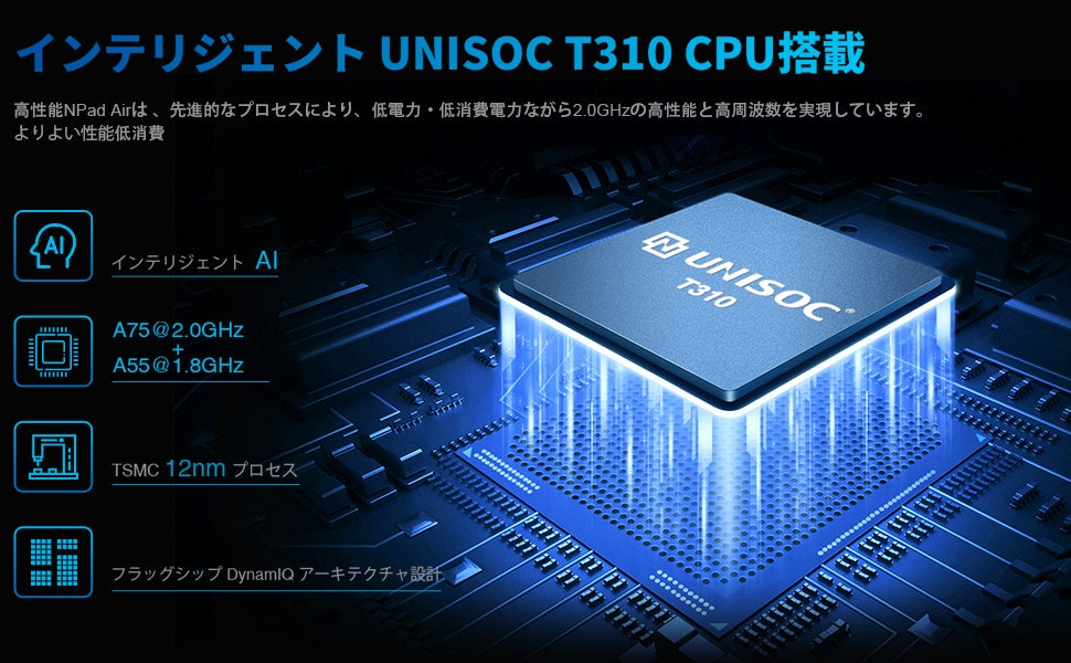 【高性能CPU+10インチHDディスプレイ】NPad AirのUNISOC T310は、TSMCの12nmプロセスで製造され、DynamIQアーキテクチャを採用しています。これにより、パフォーマンスと消費電力の両方を考慮したチップフレームワークを実現し、3つの高効率なA55コアと複数のCPUコアが連携して動作します。さらに、超省電力機能を備えており、学習、エンターテインメント、仕事の効率が大幅に向上します。Antutuのベンチマークでは高いランニングスコア(16w点)を記録し、9863aに比べて優れた性能向上率を実現しています。10.1インチの1280×800の解像度を搭載し、ディスプレイはより繊細で滑らかであり、視覚効果も優れています。