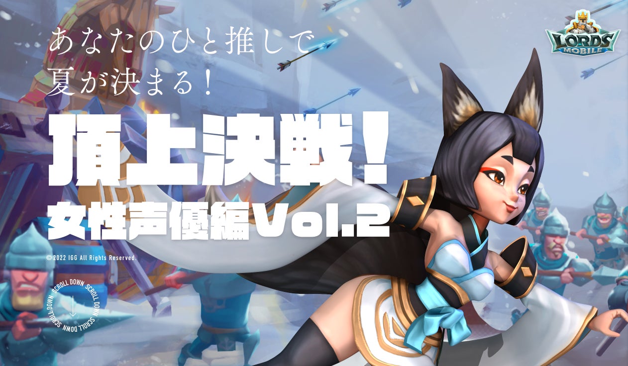 スマートフォン向けゲームアプリのグローバルメーカーIGG(グループCEO: Zongjian Cai 香港証券取引所上場 日本所在地:東京都新宿区)は、世界同時対戦RPG『ロードモバイル』において、「ロードモバイル頂上決戦!女性声優編 Vol.2」の開催を発表いたします。