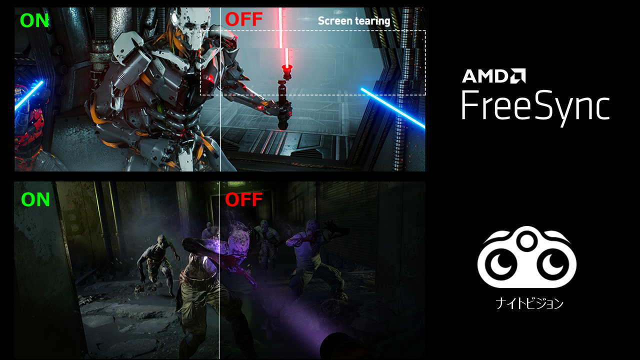 対応のグラフィックボードの組み合わせでカクつきやティアリング現象を抑え、流れるような滑らかな表示が可能です。
