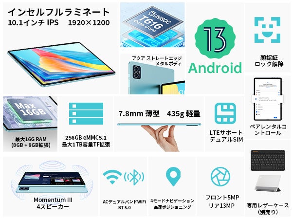 10インチ / Android 13 / 16GB(8+8拡張)RAM+128GB ROM+1TB TF拡張 / FHD IPSディスプレイ / 4G LTE+WiFiモデル / Widevine L1 / GPS機能 / 3.5mmヘッドホン端子 |