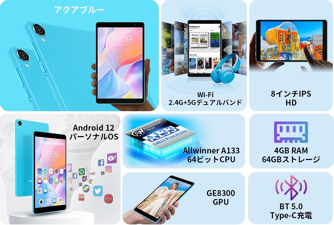 8インチ / Android 12 / 8GB(4GB+4GB拡張) RAM+64GB ROM+1TB拡張 / HD IPSディスプレイ / WIFIモデル / 3.5mmヘッドホン / 児童守護 |