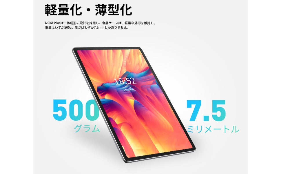 【2K 10.4インチUltra HDスクリーン+Incellウルトラスリム構成7.8mm+13MPカメラ】エヌワン NPad Plusは、2000×1200のフルHD解像度と輝度300nits(Typ)の2KフルHD IPSスクリーンを搭載し、色鮮やかで鮮明な画面表示を実現します。アスペクト比16:10で、細部まで明瞭に映し出されます。タッチパネルは画面占有率を高め、フルハイビジョンの映像を楽しむことができます。金属一体型のボディは高度で洗練された感覚を提供し、最薄部7mmで約500gの軽量設計です。旅行や出張にも便利に持ち運ぶことができ、13MPリアカメラと5MPフロントカメラを搭載し、鮮明な写真やビデオ通話を楽しむことができます。日々のオンラインミーティングや授業、エンターテインメント、写真撮影など、さまざまなニーズに応えます。