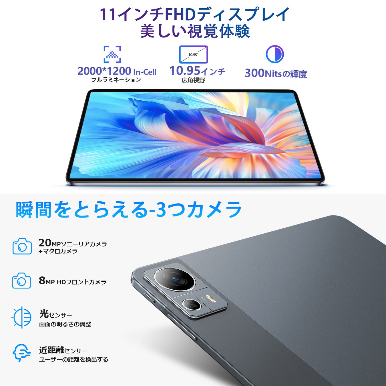 Helio G99 8コアCPU 2.2GHz、16GB(8+8拡張) RAM+128GB ROM +1TB TF拡張、11インチ 2K IPS ディスプレイ 解像度2000×1200、2.4G/5G Wi-Fi 、SIMフリー タブレット 4G LTE、20MP+8MPカメラ+GMS認証+GPS+Bluetooth5.0+無線投影+8600mAh 18W PD急速充電対応