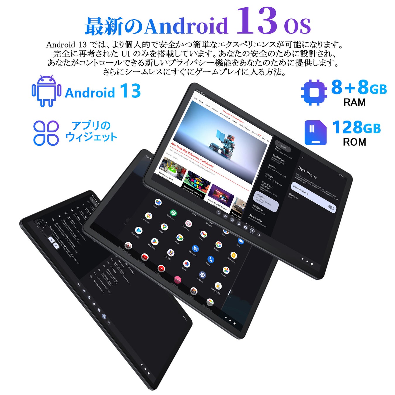 • Android 13 + GMS認証+16GB RAM、最新のシステムと大容量RAMメモリ