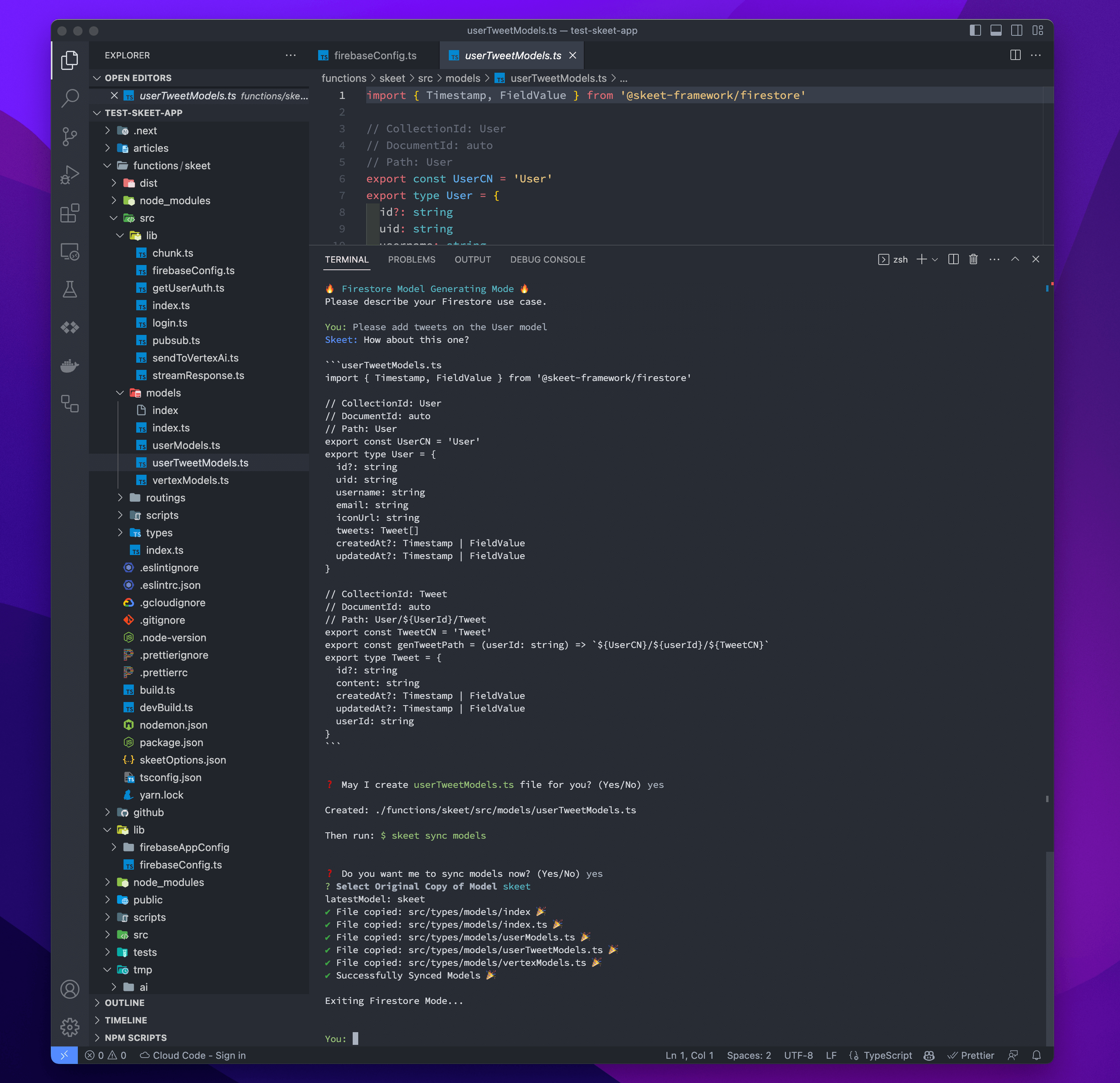 データモデルが決まれば、Skeet AI は必要なコードを自動生成するか開発者に質問します。