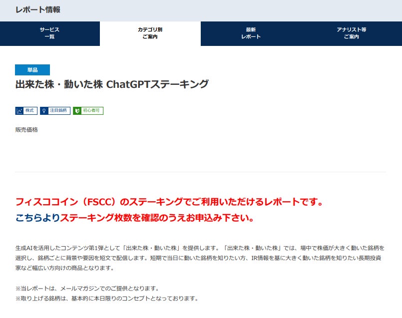 なお、フィスコでは、Web3領域においては、Learn to Earn(http://app.fisco.jp/web/lp/ltoe/ )というサービスも行っております。そこでは、フィスコWeb(https://web.fisco.jp/ )を読み学んだら、暗号資産フィスココイン「FSCC」を得ることが出来、稼いだFSCCで上記CLUB FISCOコンテンツの割引購入や一定数保有しているだけで閲覧できるレポートなどのサービスを提供しています。FSCCは暗号資産取引所Zaifに上場しており、取引所にて購入も可能です。このように、ブロックチェーンを活用することにより、投資家の皆様に金銭的負担がかからないFSCC独自の経済圏の拡大を志向しています。