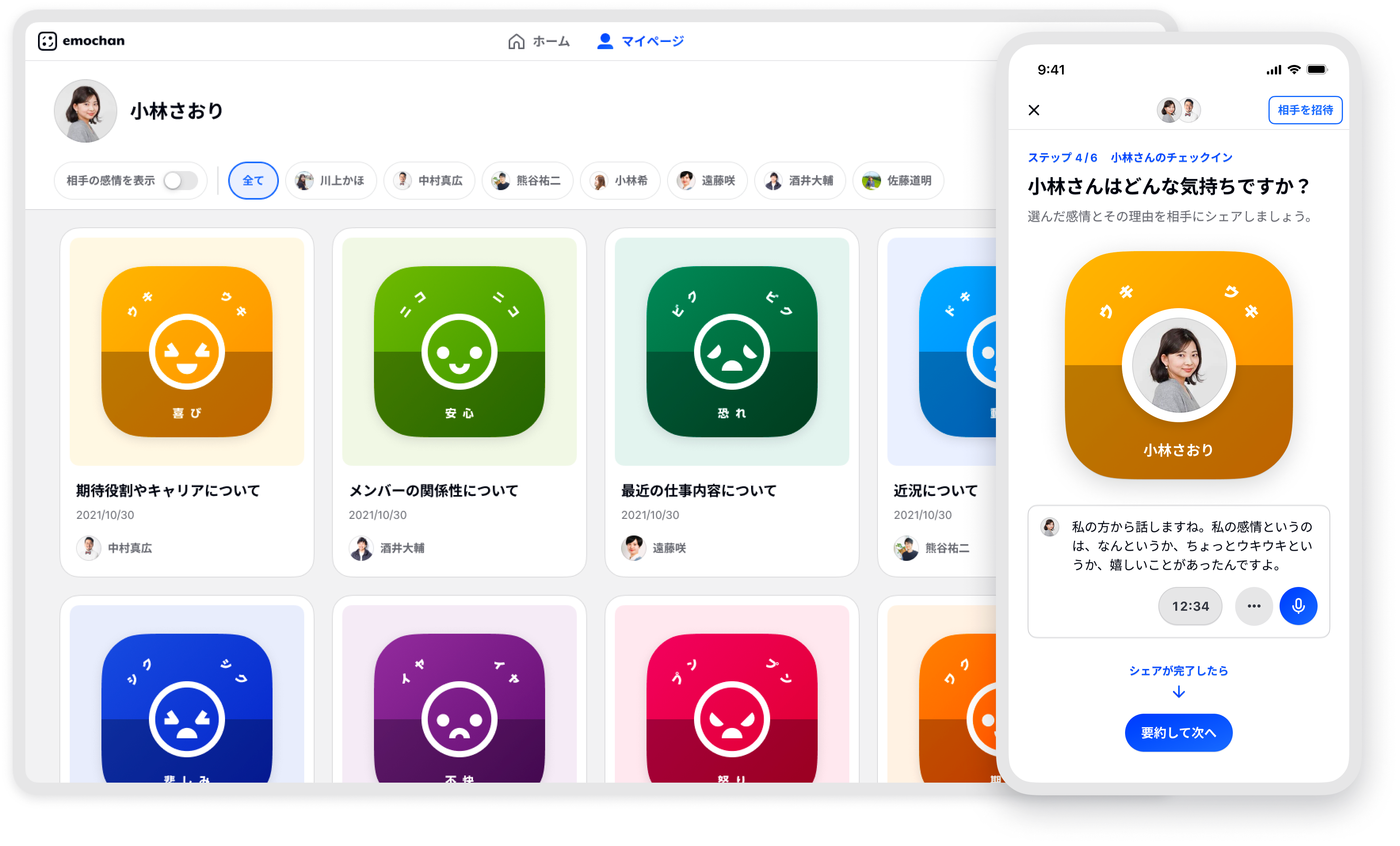 emochanは、メンバーも、マネージャーも、人事担当者も、みんなが簡単・効果的にはじめられる1on1サポートツールです。