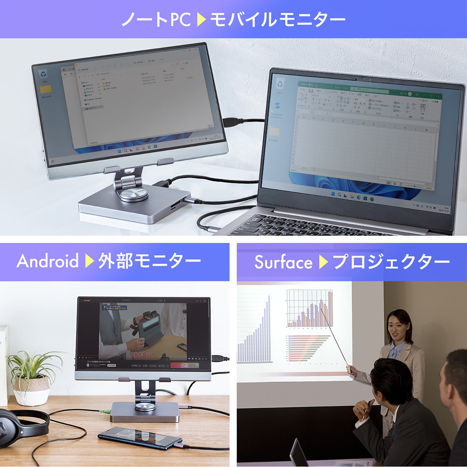 本製品は、タブレット・モバイルディスプレイに対応したスタンド付きのドッキングステーションです。