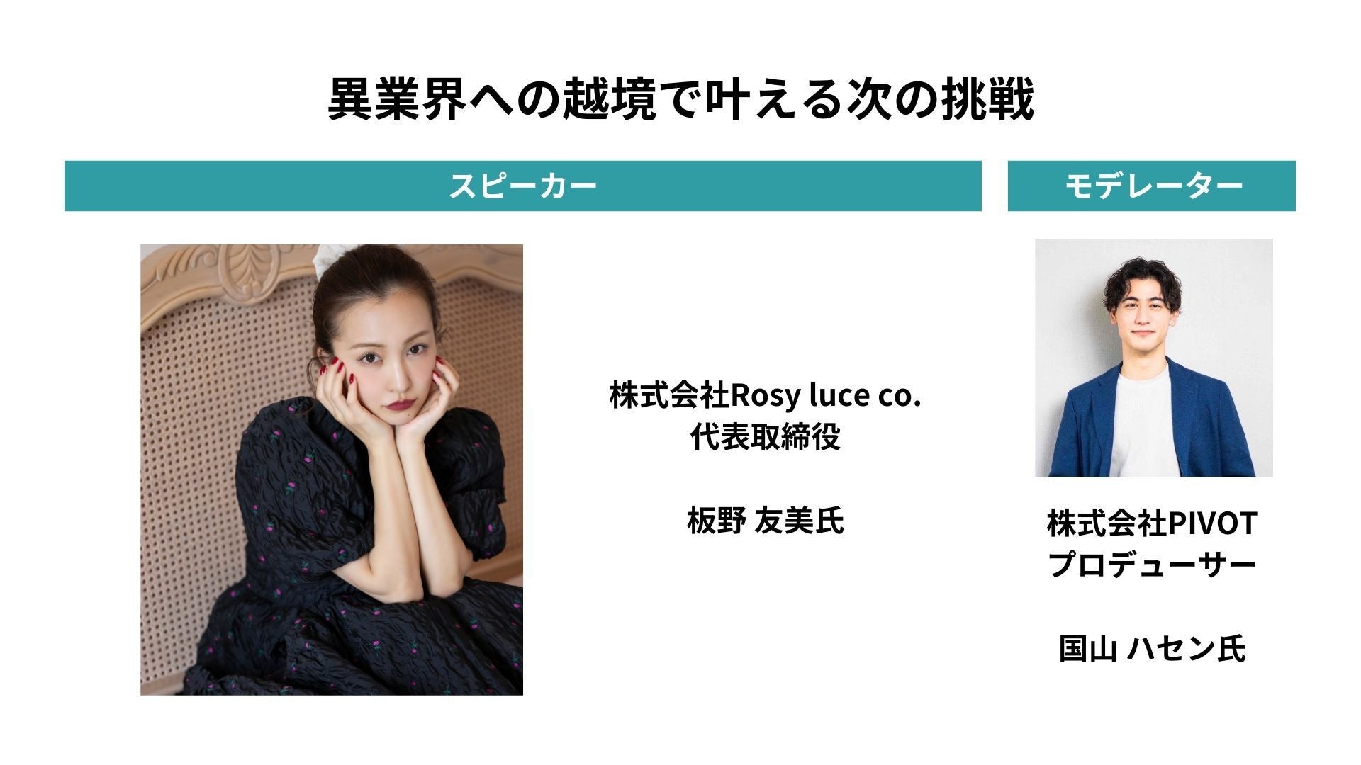 アイドル・アーティストを経てライフスタイルブランドの起業に挑戦された板野さんの考えや今後のビジョンについてお話いただきます。