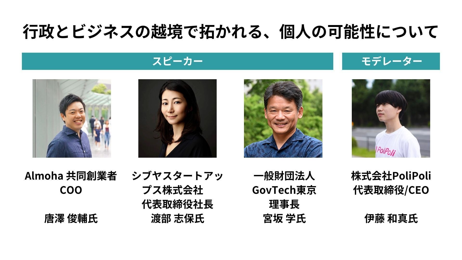ビジネス領域で活躍した後、行政の仕事に挑戦した方々を中心に、越境で得られたことや求められることなどについてセッション形式でお話しいただきます。